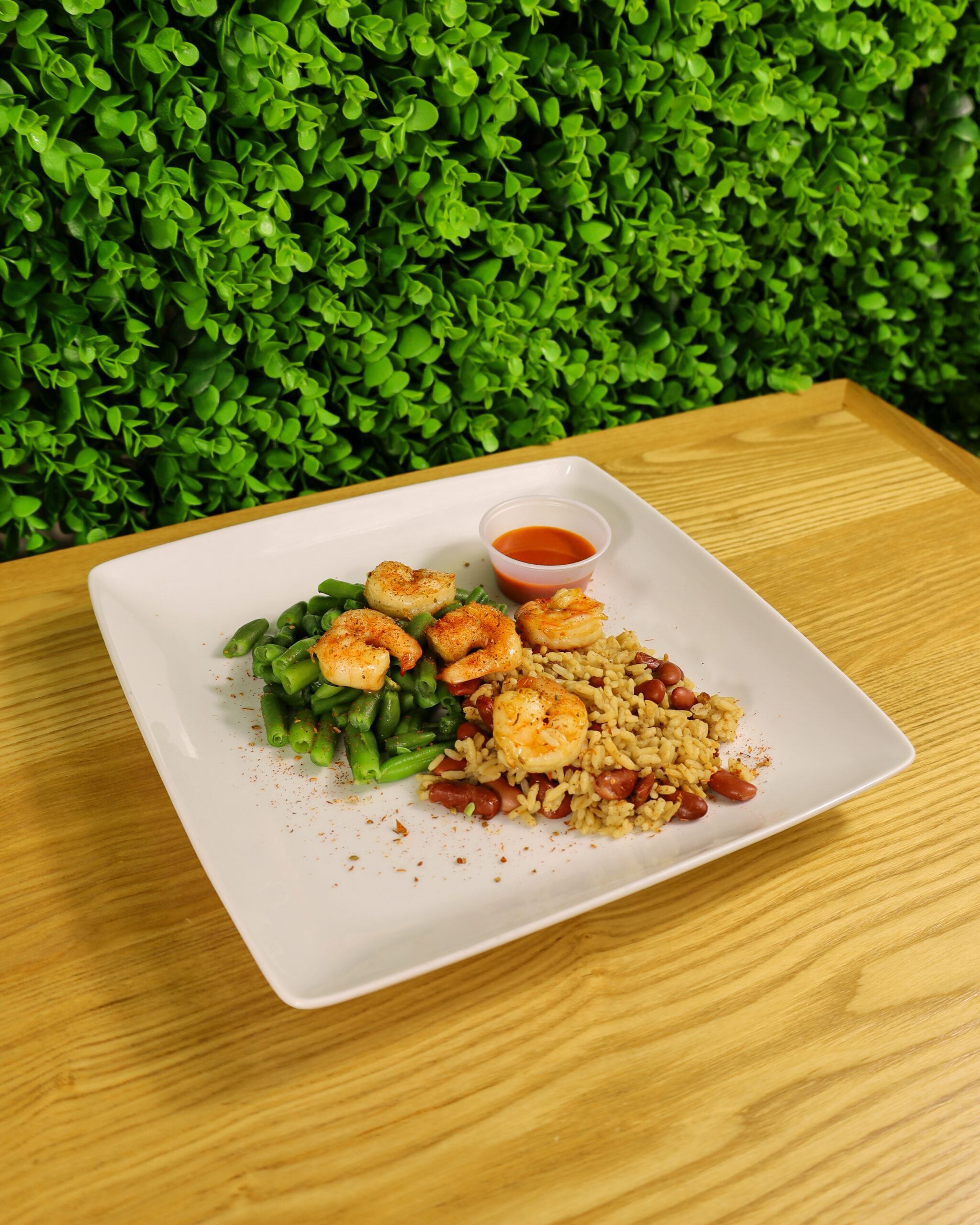 5 JUMBO CAJUN SEASONED SHRIMP PAIRED WITH DIRTY RICE & BEANS (KIDNEY), STEAMED GREEN BEANS, AND SIDE OF CHOLULA