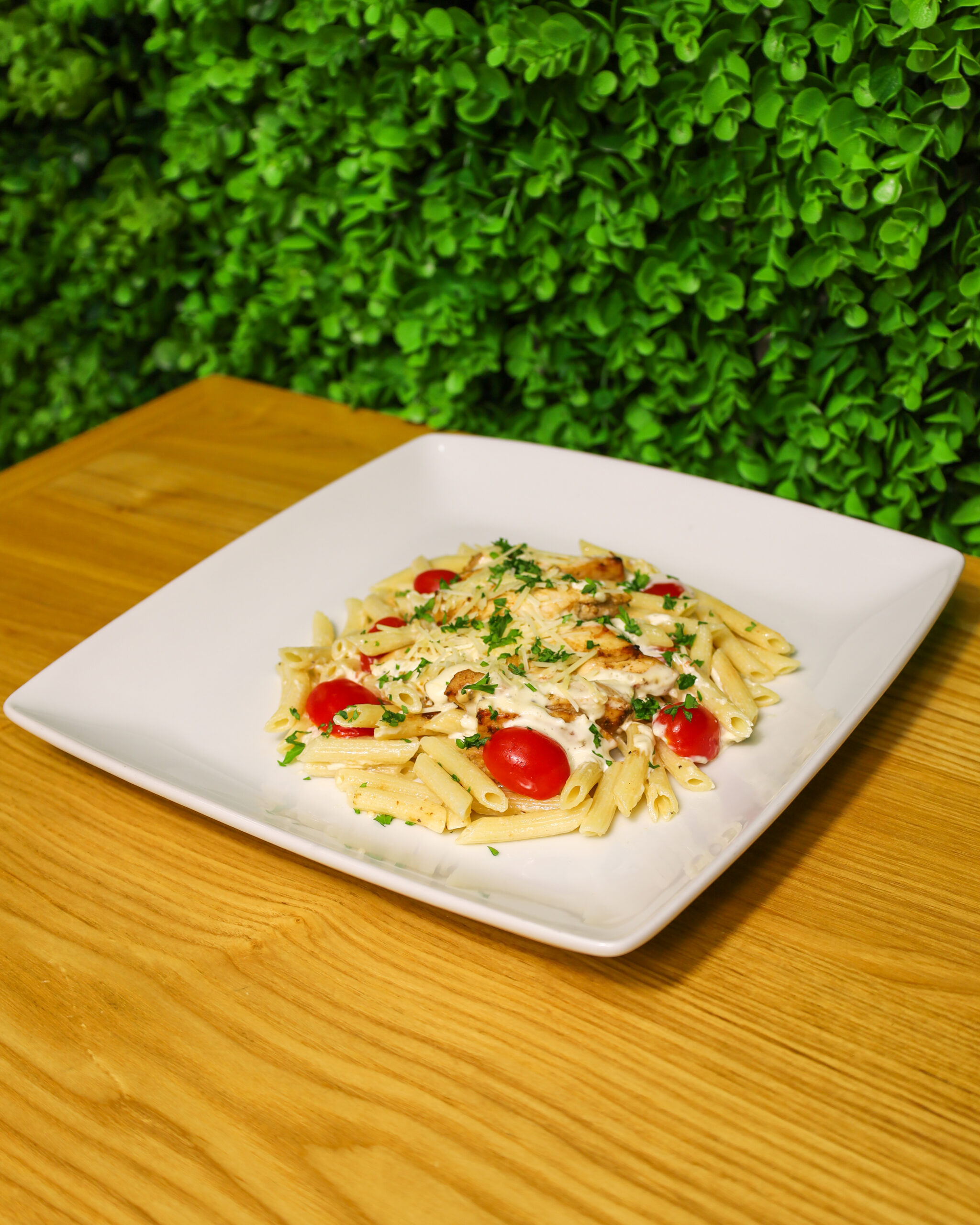MARINATED CHICKEN BREAST PAIRED WITH CREAMY CAESAR PENNE PASTA, GRAPE TOMATOES & PARMESAN CHEESE