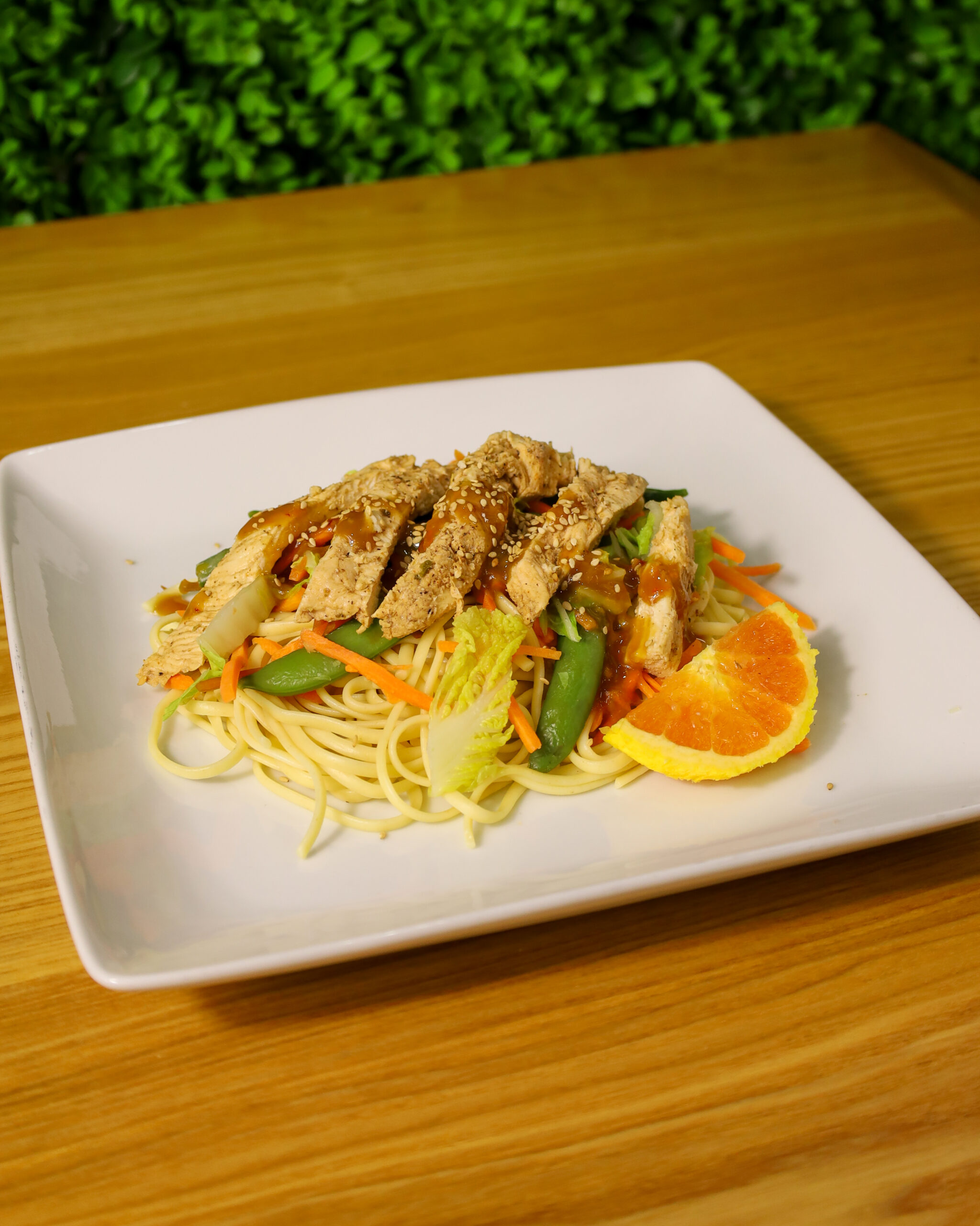 MARINATED CHICKEN BREAST PAIRED WITH LINGUINI, NAPA CABBAGE, SHREDDED CARROTS, SUGAR SNAP PEAS, AND A SIDE OF ORANGE SAUCE