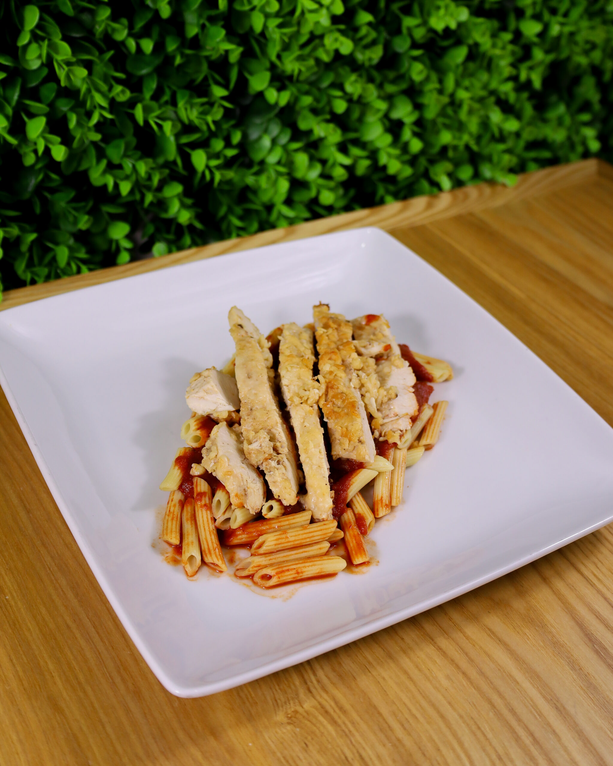 LIGHTLY BREADED CHICKEN BREAST PAIRED WITH PENNE PASTA, MARINARA, AND MOZZARELLA CHEESE