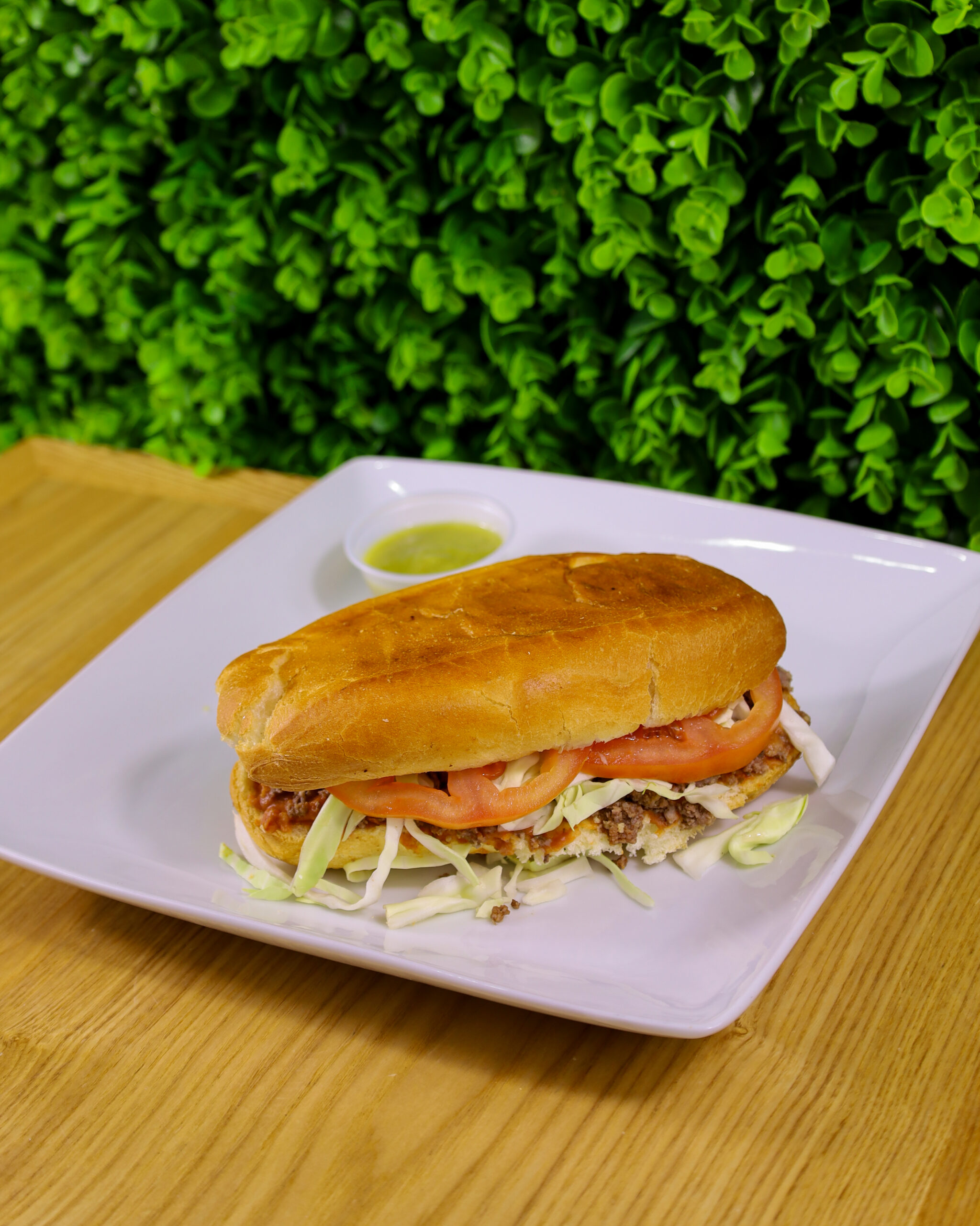 LEAN GROUND BEEF PAIRED WITH TORTA BREAD SHREDDED CABBAGE/TOMATO SLICES, AND AVOCADO LIME SALSA