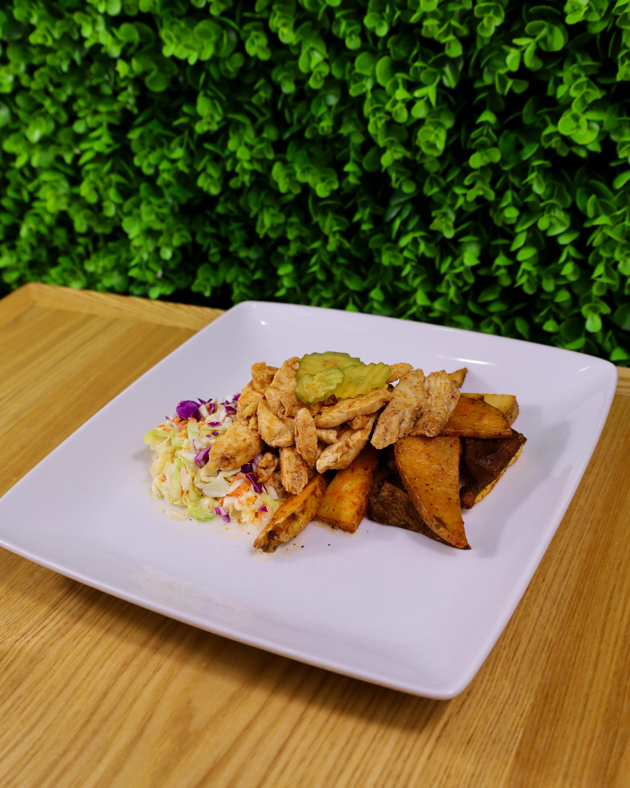 MARINATED CHICKEN BREAST COATED IN SMOKEY SWEET NASHVILLE SPICE MIX SERVED WITH SEASONED WEDGES, COLE SLAW AND PICKLE GARNISH