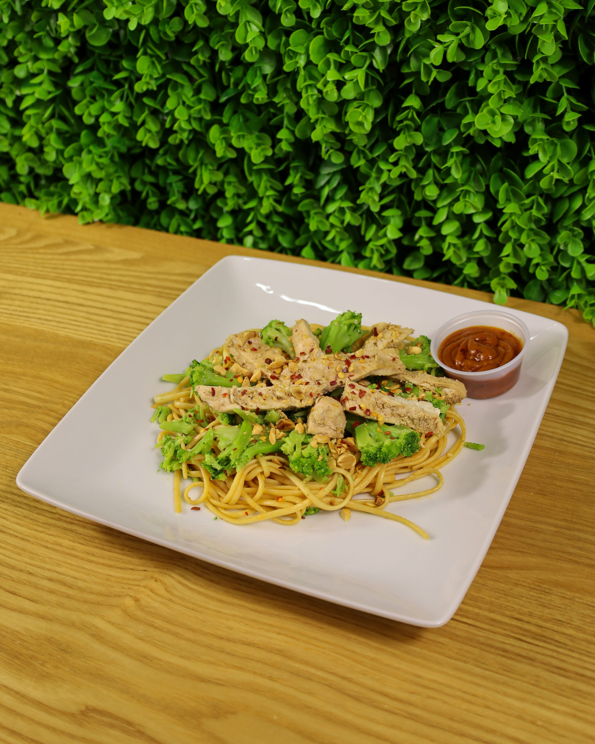 MARINATED CHICKEN BREAST PAIRED WITH PEANUT NOODLES, BROCCOLI, PEANUTS AND SIDE OF HHK SIGNATURE PEANUT DRESSING